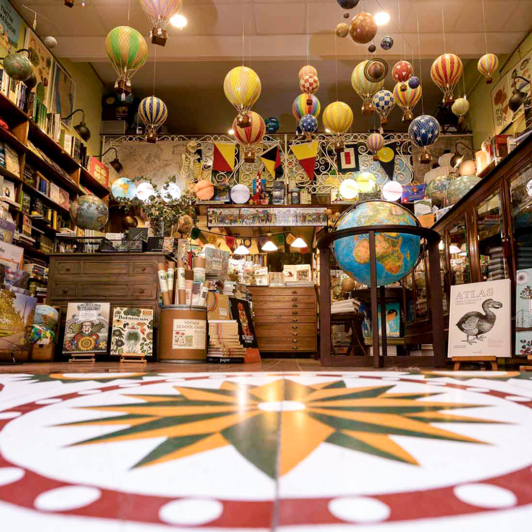 Mapas y Compañía (Málaga). Su decoración la hace única. Globos terráqueos y aerostáticos combinados con madera, convierten esta librería en un lugar mágico en el que podemos encontrar todo tipo de libros y guías sobre viajes.