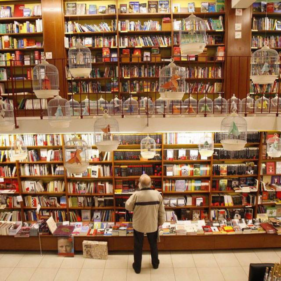 Librería Cálamo (Zaragoza). Un enorme espacio con una decoración sublime tanto en su parte de adultos como en la infantil. Te sorprenderá su decoración de jaulas con pajaritas de papel en su interior.